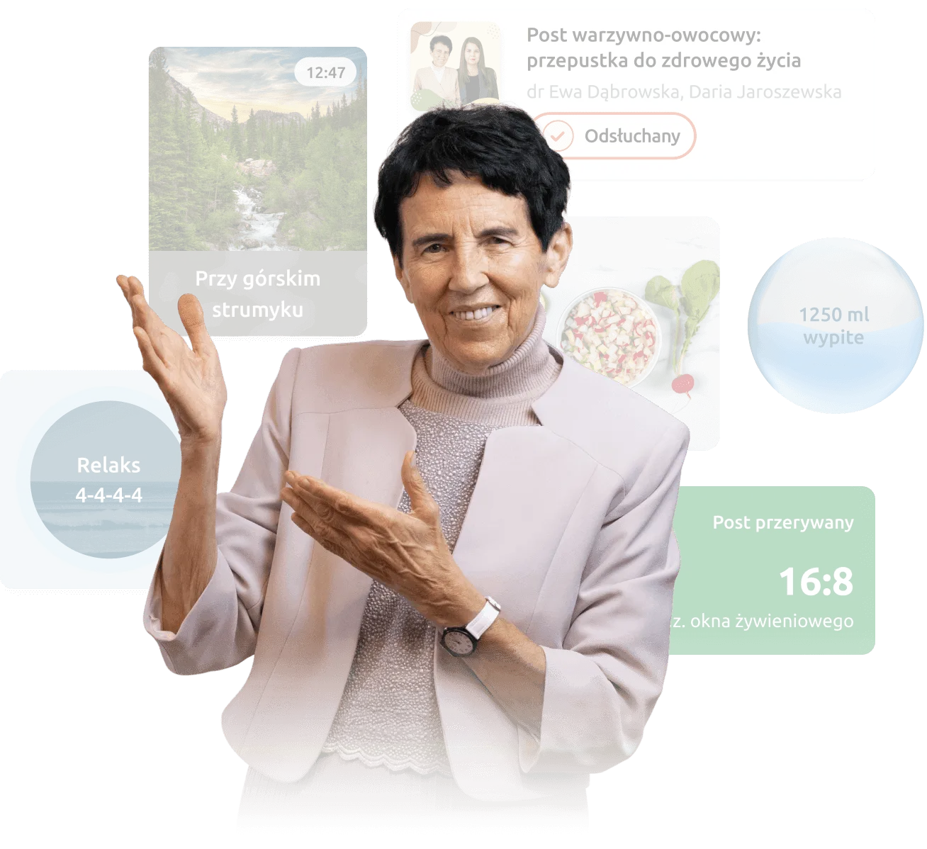 Odkryj zdrowotną moc spacerów i wzmacniaj efekty postu lub codziennej, zdrowiej diety. Funkcja Spacer to relaksacyjne ścieżki audio, które zmotywują Cię do codziennej dawki ruchu. Do tego pomogą Ci zebrać myśli, odprężyć się i zrelaksować. Z nimi zmienisz zwykły spacer we wzmacniający rytuał.