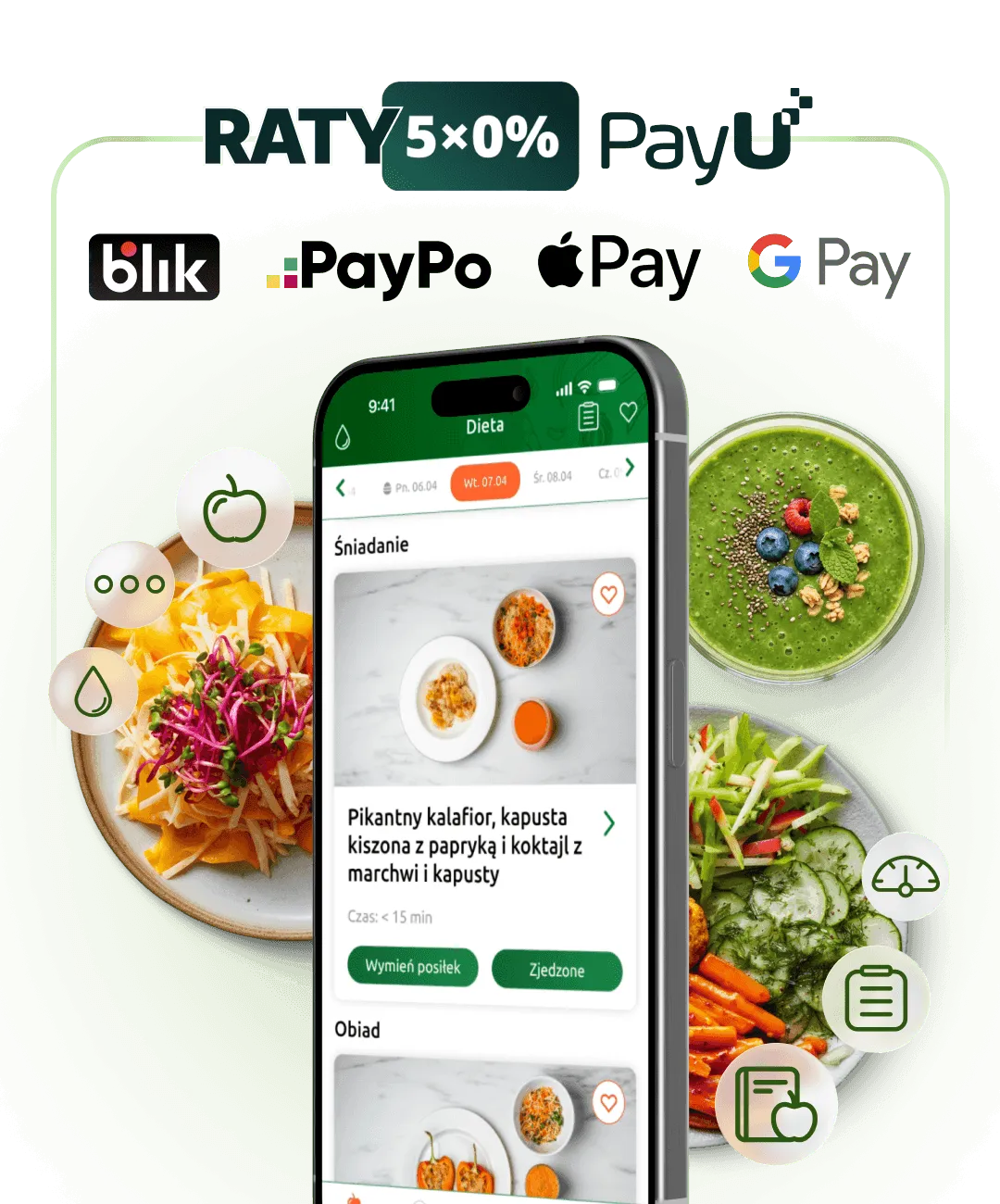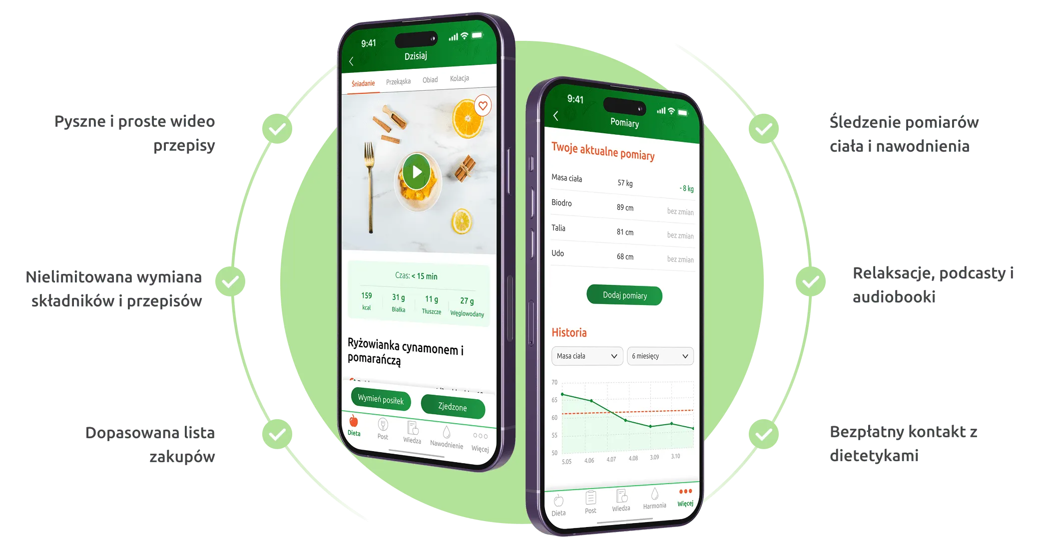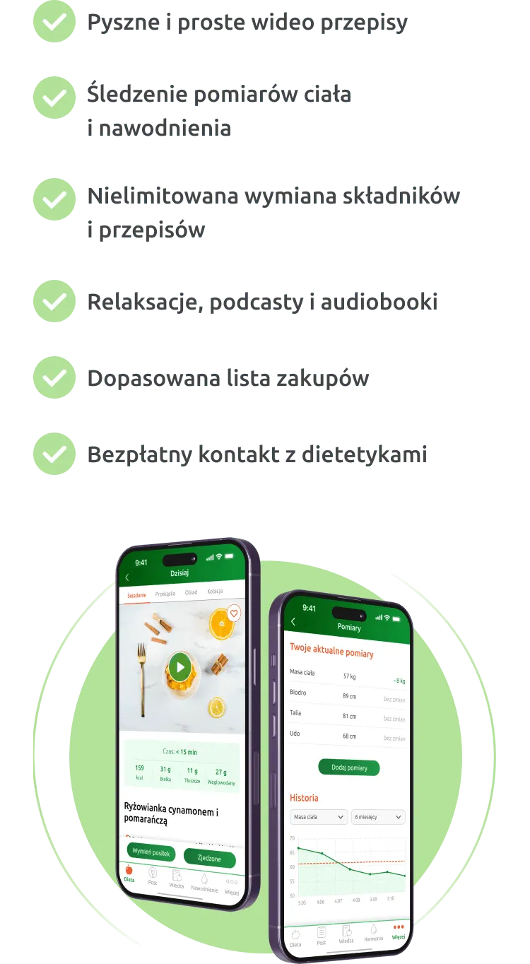 W aplikacji znajdziesz gotowe jadłospisy na każdy z tych etapów, ale także szereg funkcji, dzięki którym wprowadzisz nowe, zdrowe nawyki do swojej codzienności.