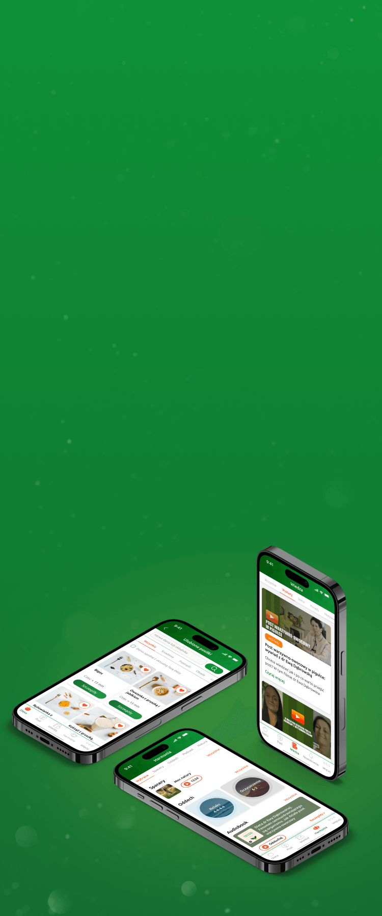 Harmonia to nowość, z którą zadbasz także o duchowy wymiar swojej zdrowej przemiany. Ćwiczenia oddechowe, relaksacje, dźwięki natury i fragmenty Pisma Świętego przyniosą Ci wyciszenie oraz czas na refleksje. A z podcastami i audio poradami w prosty sposób zwiększysz wiedzę dotyczącą zdrowego stylu życia.